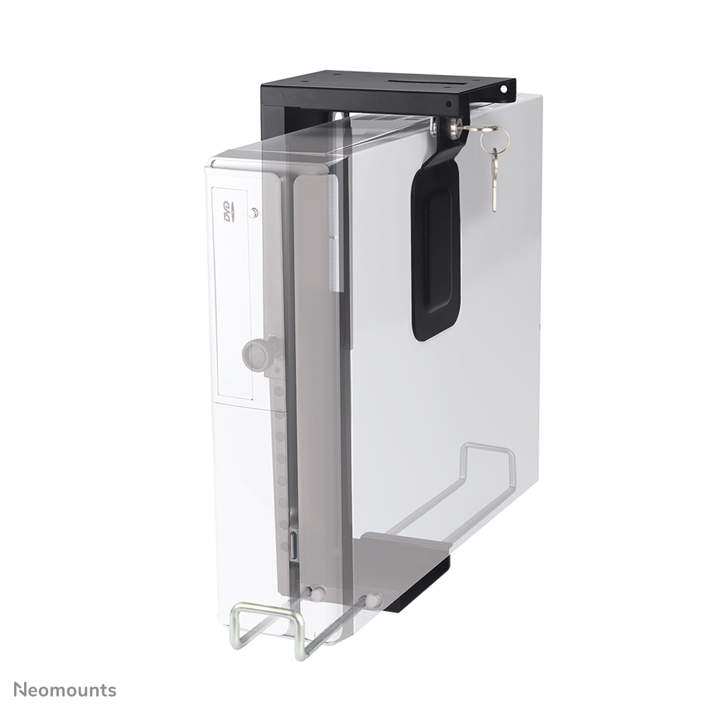 This Neomounts CPU mount, model CPU-D075BLACK/LK, allows you to mount a computer under a desk and to secure it using a locking system. A CPU mount creates a need and clean desk because its stored under the desk and doesn't use any valuable desk space. Increase the lifetime of your CPU due to reduction intake dust and dirt from floors. Keep the workplace clean without computers on the floor.\n\nThis Neomounts CPU mount allows vertical installation of computers. Hide your cables and keep the workplace nice and tidy.\n\nEasy to adjust in width and depth to fit most desktop and tower PCs. The specifications listed show maximum and minimum width and depth of the mount.\n\nAll installation material is included with the product.