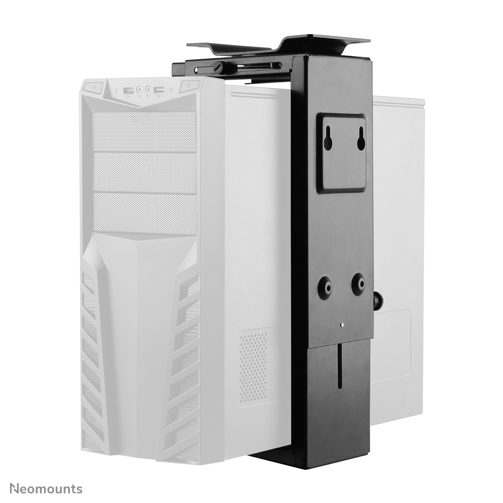 This Neomounts CPU mount, model NM-CPU100BLACK, allows you to mount a computer under a desk. A CPU mount creates a need and clean desk because its stored under the desk and doesn't use any valuable desk space. Increase the lifetime of your CPU due to reduction intake dust and dirt from floors. Keep the workplace clean without computers on the floor.\n\nThis Neomounts CPU mount allows vertical installation of computers under a desk. Also the NM-CPU100BLACK can be mounted on a wall. Hide your cables and keep the workplace nice and tidy.\n\nEasy to adjust in width and depth to fit most desktop and tower PCs. The mount can be swivelled 360 degrees. The specifications listed show maximum and minimum width and depth of the mount.\n\nAll installation material is included with the product.