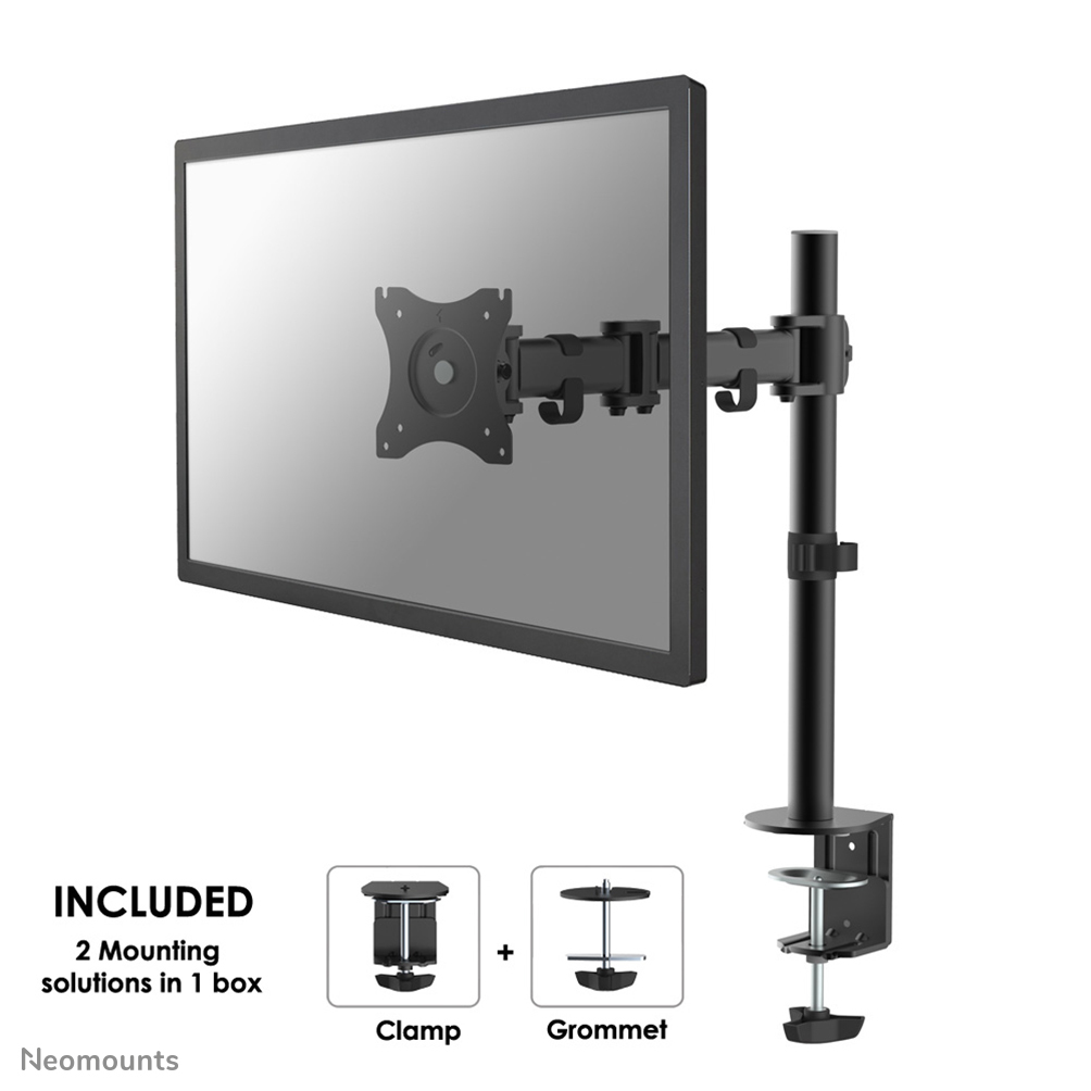 The Neomounts desk mount, model NM-D135BLACK is a tilt-, swivel and rotatable desk mount for flat screens up to 27". This mount is a great choice for space saving placement on desks using a desk clamp or grommet mount.\n\nNeomounts versatile tilt (90°), rotate (360°) and swivel (180°) technology allows the mount to change to any viewing angle to fully benefit from the capabilities of the flat screen. The mount is manually height adjustable from 0 to 41,5 centimetres. Depth adjustable from 0 to 41 centimetres. An innovative cable management conceals and routes cables from mount to flat screen. Hide your cables to keep the workplace nice and tidy.\n\nNeomounts NM-D135BLACK has three pivot points and is suitable for screens up to 27". The weight capacity of this product is 8 kg each screen. The desk mount is suitable for screens that meet VESA hole pattern 75x75 or 100x100mm. Different hole patterns can be covered using Neomounts VESA adapter plates.\n\nBy using an ergonomic mount neck- and back complaints can be avoided. Ideal for use in offices and on counters or in a reception area.\n\nAll installation material is included with the product.