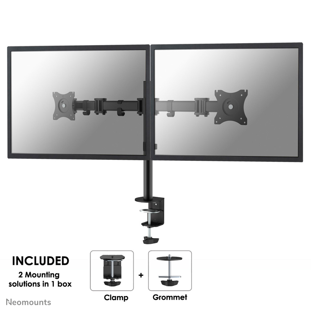 The Neomounts desk mount, model NM-D135DBLACK is a tilt-, swivel and rotatable desk mount for 2 flat screens up to 27". This mount is a great choice for space saving placement on desks using a desk clamp or grommet mount.\nNeomounts versatile tilt (90°), rotate (360°) and swivel (180°) technology allows the mount to change to any viewing angle to fully benefit from the capabilities of the flat screen. The mount is manually height adjustable from 0 to 41,5 centimetres. Depth adjustable from 0 to 42,7 centimetres. An innovative cable management conceals and routes cables from mount to flat screen. Hide your cables to keep the workplace nice and tidy.\nNeomounts NM-D135DBLACK has three pivot points and is suitable for screens up to 27" (69 cm). The weight capacity of this product is 8 kg each screen. The desk mount is suitable for screens that meet VESA hole pattern 75x75 or 100x100mm. Different hole patterns can be covered using Neomounts VESA adapter plates.\nBy using an ergonomic mount neck- and back complaints can be avoided. Ideal for use in offices and on counters or in a reception area.\nAll installation material is included with the product.
