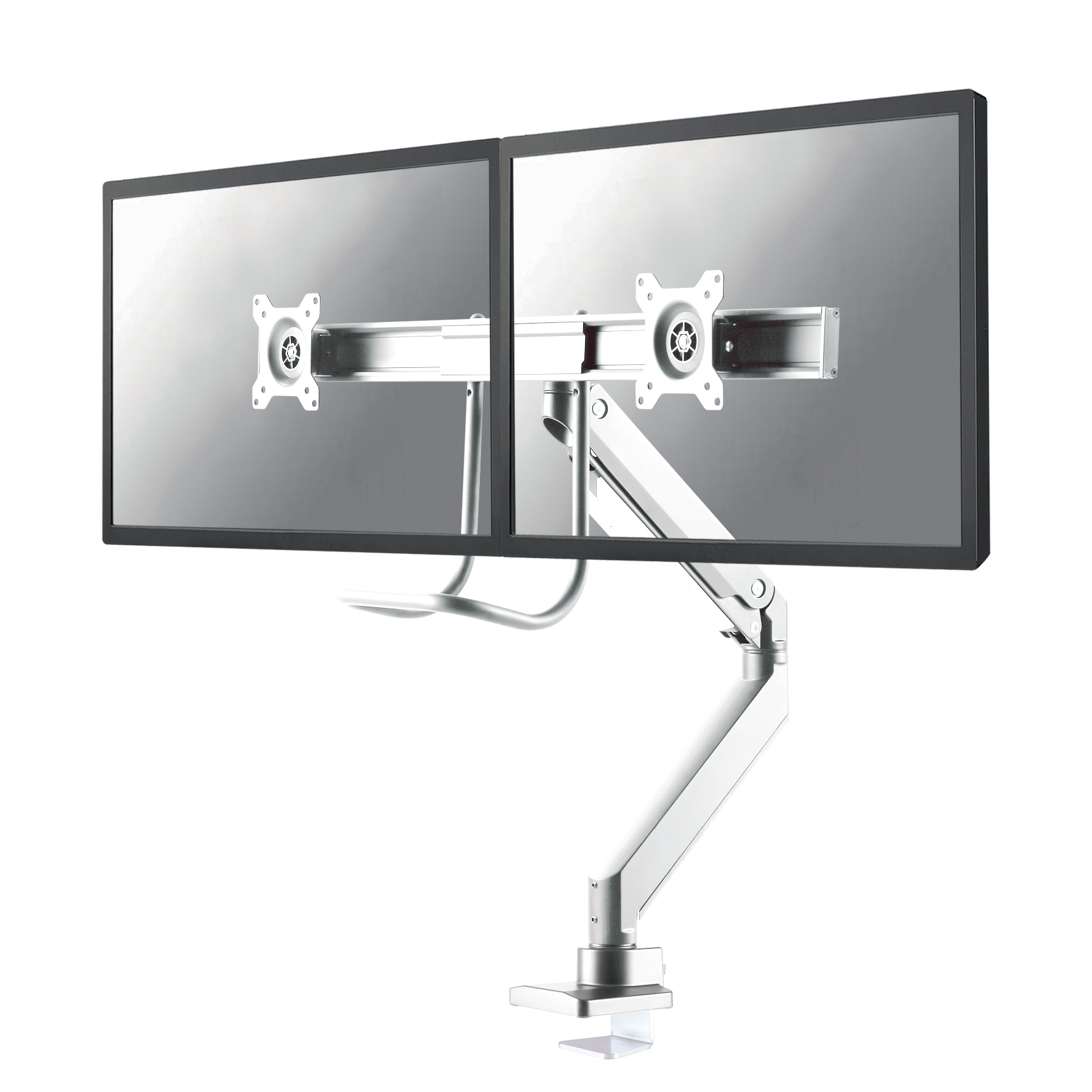 The Neomounts NM-D775DXWHITE is a tilt-, swivel and rotatable desk mount with crossbar and handle for 2 flat screens up to 32". This mount is a great choice for space saving placement on desks using a desk clamp or grommet mount.\nNeomounts' unique tilt (20°), rotate (360°) and swivel (180°/360°) technology allows the mount to change to any viewing angle to fully benefit from the capabilities of the flat screen. The mount is easily individually height adjustable to 60 centimetres using a gas spring. Depth adjustable from 0 to 63 centimetres. A unique cable management conceals and routes cables from mount to flat screen. Hide your cables to keep the workplace nice and tidy. The mount is equipped with a 180° stop mechanism.\nNeomounts NM-D775DXWHITE with handle has three pivot points and is suitable for screens up to 32" (81 cm). The weight capacity of this product is 1 to 16 kg (max. 8 kg each screen). The desk mount is suitable for screens that meet VESA hole pattern 75x75 or 100x100mm. Different hole patterns can be covered using Neomounts VESA adapter plates.\nBy using an ergonomic mount neck- and back complaints can be avoided. Ideal for use in offices and on counters or in a reception area.\nAll installation material is included with the product.
