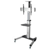 The DMCS3270XP Mobile TV Cart allows you to mount a flat- or curved-panel television, monitor or other display and move it from room to room for best viewing or against a wall out of the way when not in use. Recommended for classrooms, lecture halls, offices, auditoriums and conference rooms, the height-adjustable mobile stand fits most displays from 32 to 70 inches.\n\nYou can adjust this heavy-duty rolling TV stand's height from 47 to 81.5 inches. You can also rotate the display for viewing in portrait or landscape modes. Roll the unit with little effort to the proper viewing location and angle on sturdy three-inch swivel casters that move smoothly through doorways and over thresholds. All four casters lock to keep the stand securely in position.\n\nA shelf mounted above the display holds projectors, webcams and laptops. A lower shelf supports up to 11 lbs (4.9 kgs) and holds other audio/video components, such as a Blu-ray player. Durable aluminum and steel construction supports up to 150 lbs (68 kgs). The adapter brackets can be adjusted to conform to VESA-compliant displays with any of the following mounting hole patterns: 200 x 200, 200 x 300, 200 x 400, 300 x 200, 300 x 300, 300 x 400, 400 x 200, 400 x 300, 400 x 400, 500 x 200, 500 x 300, 500 x 400, 600 x 300 and 600 x 400