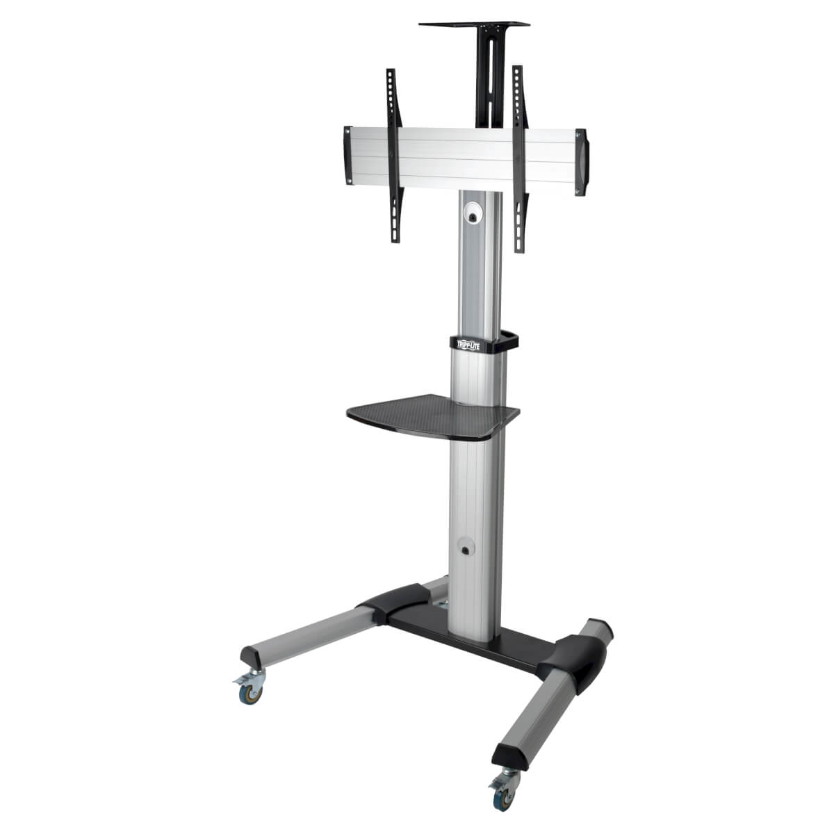 The DMCS3270XP Mobile TV Cart allows you to mount a flat- or curved-panel television, monitor or other display and move it from room to room for best viewing or against a wall out of the way when not in use. Recommended for classrooms, lecture halls, offices, auditoriums and conference rooms, the height-adjustable mobile stand fits most displays from 32 to 70 inches.\nYou can adjust this heavy-duty rolling TV stand's height from 47 to 81.5 inches. You can also rotate the display for viewing in portrait or landscape modes. Roll the unit with little effort to the proper viewing location and angle on sturdy three-inch swivel casters that move smoothly through doorways and over thresholds. All four casters lock to keep the stand securely in position.\nA shelf mounted above the display holds projectors, webcams and laptops. A lower shelf supports up to 11 lbs (4.9 kgs) and holds other audio/video components, such as a Blu-ray player. Durable aluminum and steel construction supports up to 150 lbs (68 kgs). The adapter brackets can be adjusted to conform to VESA-compliant displays with any of the following mounting hole patterns: 200 x 200, 200 x 300, 200 x 400, 300 x 200, 300 x 300, 300 x 400, 400 x 200, 400 x 300, 400 x 400, 500 x 200, 500 x 300, 500 x 400, 600 x 300 and 600 x 400