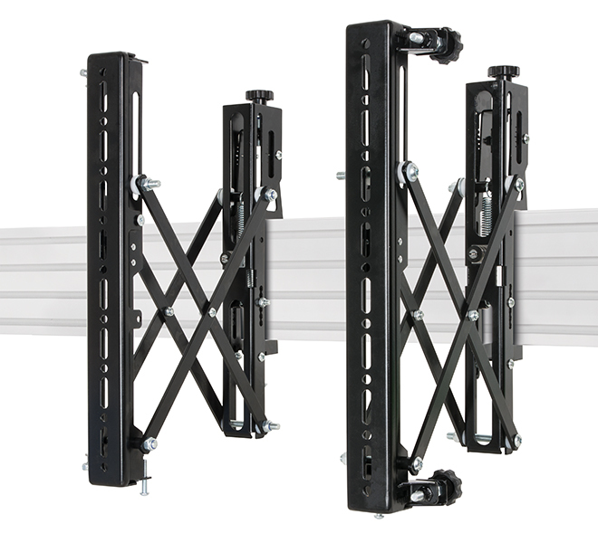 Ideal for assembling videowalls and other multi-screen applications, these interface arms are designed to mount medium to large sized screens on to System X horizontal mounting rails, providing a solution with easy pop-out access to aid installation and screen maintenance. The universal design is compatible with all videowall screens and the modular design allows an almost endless number of configurations to be assembled, in both landscape or portrait orientations. Tool-less micro-adjustment allows perfect alignment of displays and a mounted depth of 105.4mm from the wall allows easy access for cables and connectors.