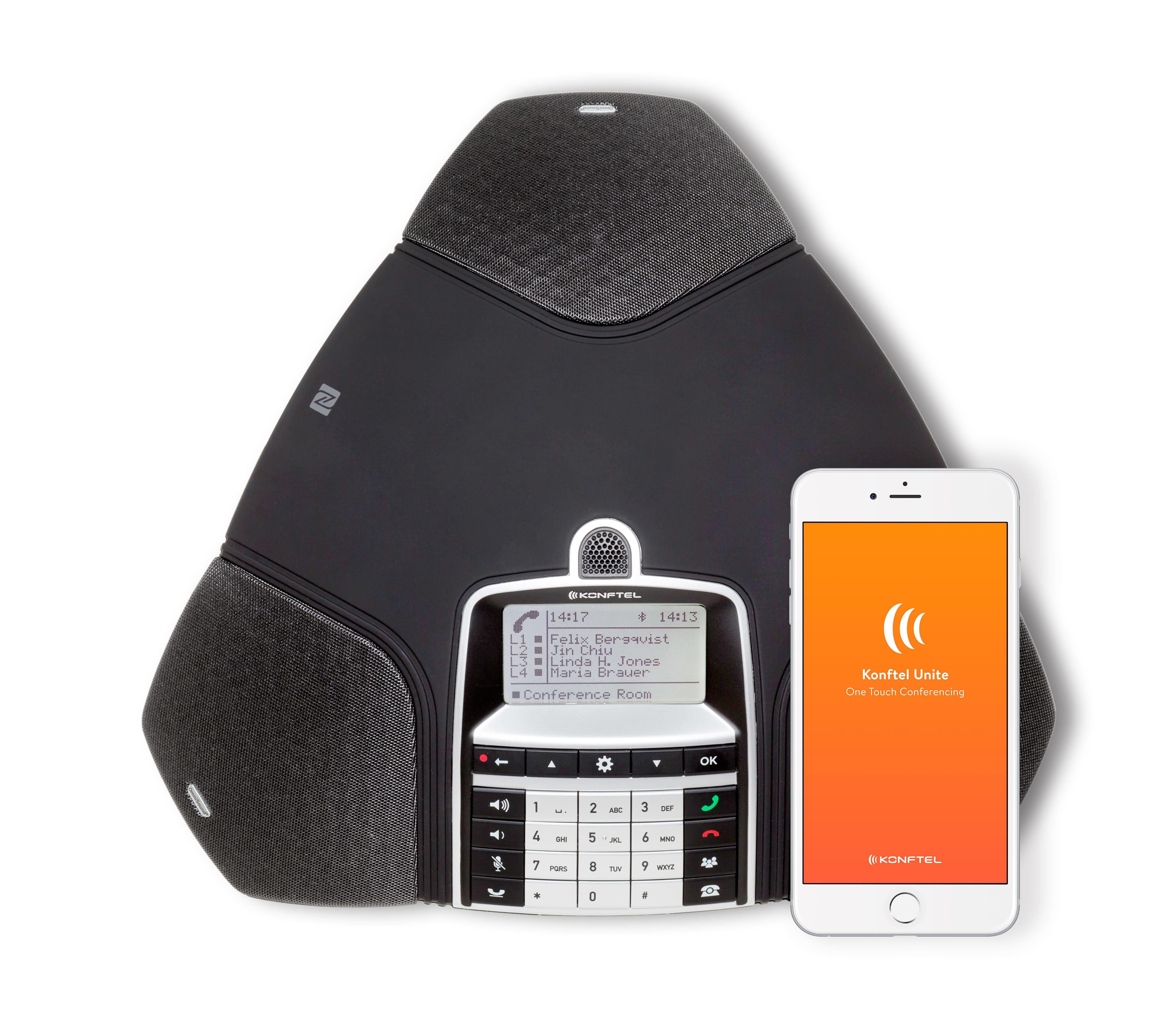 The Konftel 300IPx together with the Konftel Unite app brings a whole new easiness to conference calls. It is highly intuitive and based on our natural mobile behaviour. The new generation of IP conference phone is – The Art of Easiness. Add optional expansion microphones for medium to large rooms, or a PA interface box for up to extra large rooms.