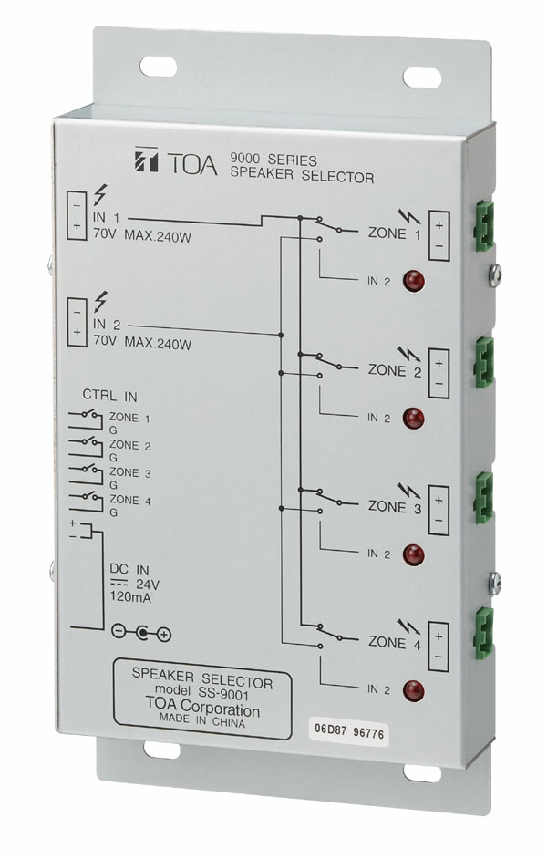 The SS-9001 is a speaker selector used in conjunction with the 9000 series amplifier. It outputs 2 input signals to 4 different zones.