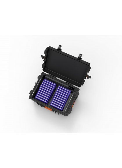 • Protection against overvoltage • Smart charge 2.1 A • Reinforced frame • Individual LED charge progress indicators • Extendable arm and 2 wheels for easy transport