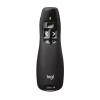 Logitech® Wireless Presenter R400 is designed to help you make your point. Its intuitive slideshow controls help you navigate through your presentation with confidence. Buttons are easy to find by touch. And its shape feels great in your hand. It’s got a red laser pointer that’s easy to see against most backgrounds and a range of up to 50 feet (15 meters), so you’ve got the freedom to move around the room and mingle with your audience. A storable plugandplay wireless receiver makes it simple to get started—there’s no software to install. And when you’re through, the receiver stores inside the presenter to make packing up easy.