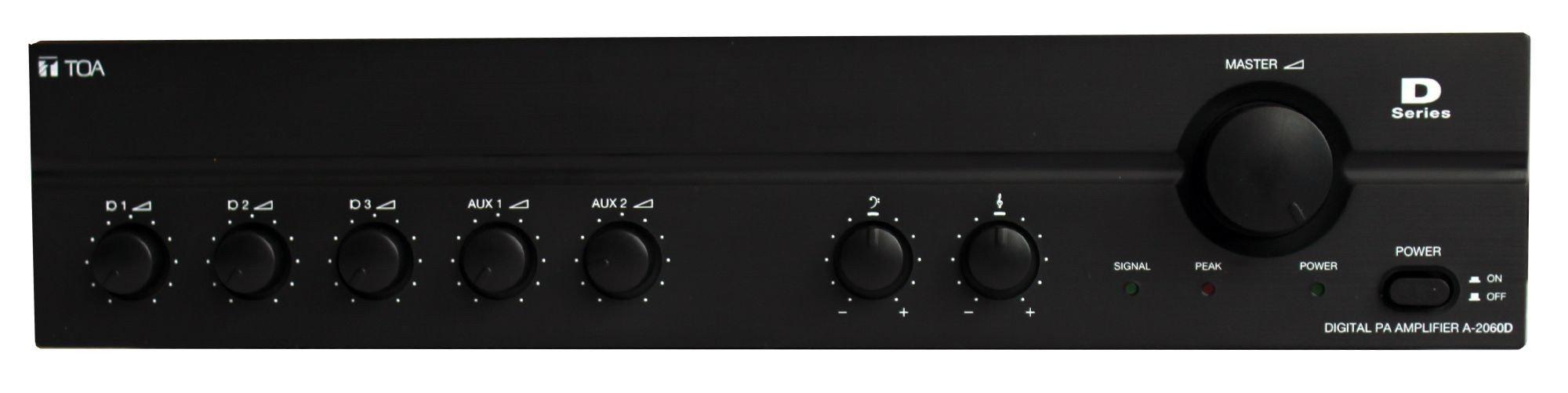 Digital Mixer Amplifiers\n\nThe A-2030DD-EB is a high cost-performance mixer power amplifier suited for broadcasting paging or background music in schools, offices, shops, factories, mosques, churches and large rooms.\n\nDiscover all benefits on our landing page\nThe A-2000D Series is a range of high performance mixer power amplifiers at an optimal price/performance ratio: with excellent sound, energy efficient and eco-friendly. The A-2000D Series is suited for broadcasting paging or background music in schools, offices, shops, houses of worship and factories. Crystal clear announcements and high sound quality - the A-2000D is equipped with balanced microphone inputs for better isolation from external noise and provided with priority function on input #1, muting all other inputs when active.\n\nThe mixer power amplifier designed on power saving digital technology, supplied by AC main power with main power switch and power on indicator at front site, and shall control and mix 3 balanced MIC (phone jack and mini XLR) and 2 unbalanced (RCA pin jack) AUX inputs. Speaker outputs shall be balanced (floating) high-impedance, and there shall be a low-impedance REC out. The amplifier shall meet the following performance criteria: Power output shall be 30 W at less than 1% THD (at 1 kHz, 1/3 rated power). Frequency response shall be 50 Hz to 20 kHz (+/-3 dB), with an S/N ratio of over 60 dB. Phantom power (DC +21 V) and muting (of other input signals by 0 – 30 dB attenuation) shall be available for MIC 1. Bass Tone Control shall be +/-10 dB at 100 Hz, and Treble Tone Control shall be +/-10 dB at 10 kHz. Power, signal and peak indicators shall be provided. The panel shall be ABS black resin, and the case black steel plate. Dimensions shall be 420 (W) x 100.6 (H) x 280.3 (D) mm, and weight 4.0kg.\n\nThe mixer power amplifier shall be TOA model A-2030DD.