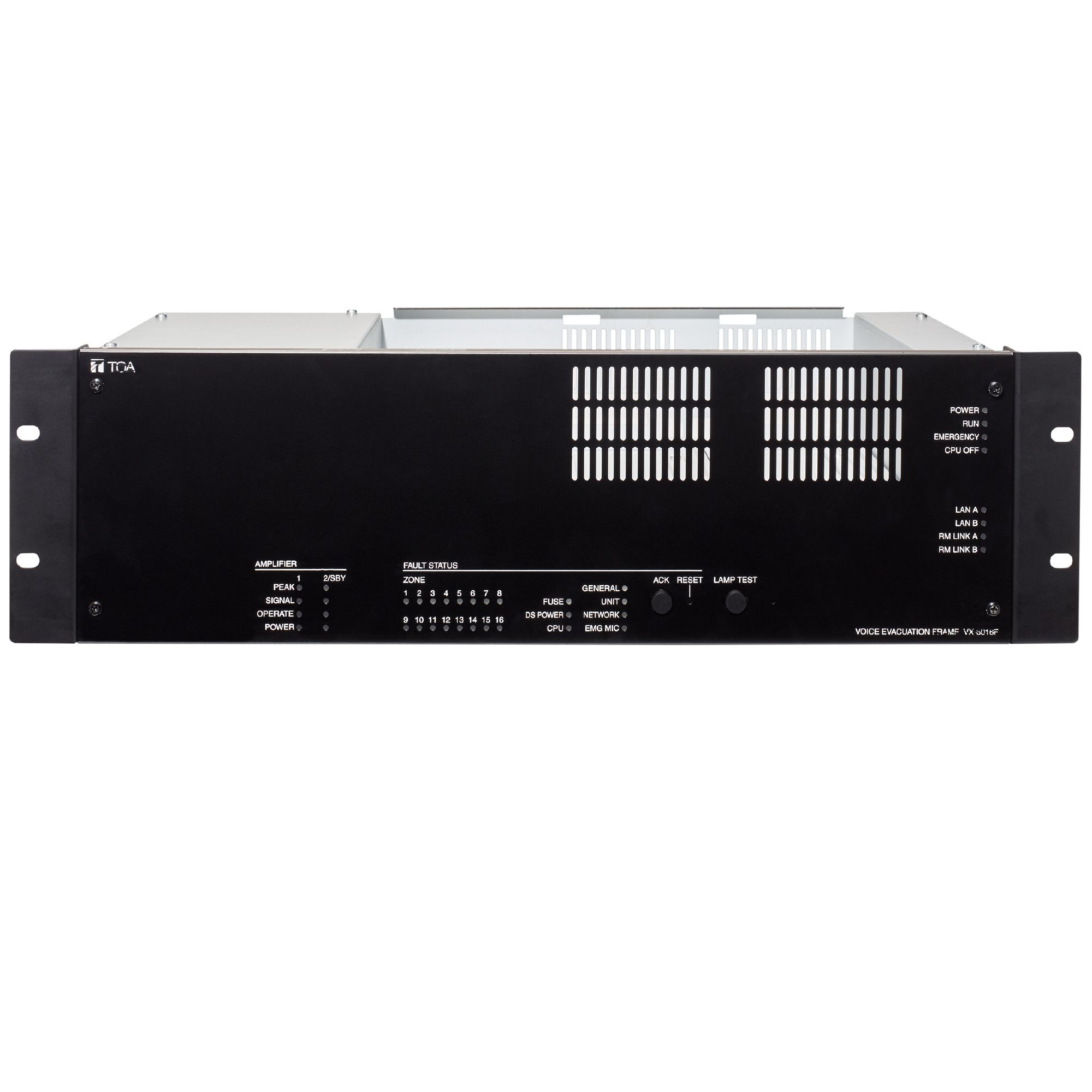 The VX-3016F frame is one of three system managers of TOA's VX-3000 series rack-mount type public address and voice evacuation system certified according to the European Standard EN 54-16.\n\nIt provides 16 speaker line outputs/zones. Either one amplifier drives all 16 line outputs/zones or two amplifiers drive 8 line outputs/zones each. Up to three additional VX-3016F frames without amplifiers can be added to expand the number of zones of the version with one amplifier installed. The amplifier modules can be easily mounted and removed. Up to two power amplifier modules of different wattages can be mounted, of which the second one can either be used for the zones or as a standby amplifier. The standby amplifier, when mounted, can be shared among other VX-3000F units. Each amplifier channel has the following DSP functions: different filter types (PEQ, HPF, LPF, shelving, CD-horn EQ, notch), compressor and delay that enables appropriate acoustic adjustment for any broadcast area. The smart ANC function enables the control of ambient noise and is not affected by the audio signal it controls. Therefore, the sensor’s installation location is not critical. The monitoring of the speaker lines can be selected between impedance monitoring with selectable pilot tone or by end-of-line modules.\n\nThe VX-3016F has 4 balanced audio input terminals from microphone up to line level sensitivity, with phantom power selection for microphone use. The inputs can also be set for receiving an emergency broadcast from another VA system of higher priority and broadcast it under the condition of the emergency mode. Up to 8 remote microphones can be connected via RJ45 ports; two of which can be emergency microphones. The following DSP functions are available for each input channel: different filter types (PEQ, HPF, LPF, shelving) and compressor. Helpful features such as feedback suppressor or voice-controlled broadcast activation (VOX) enhance the usability of the system.