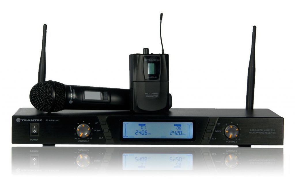 The Trantec S2.4HBX Digital Dual Wireless System operates on the 2.4GHz digital frequency band. 16 switchable channels with wide channel spacing ensure interference-free operation, whilst Digital Audio Processing Technology provides natural sound with exceptional clarity. The system’s dual-channel receiver is equipped with a bright LCD display, showing you important information such as the channel number, current frequency, RF signal strength and audio level at a glance. The receiver is housed inside a rugged metal enclosure, providing exceptional durability as well as enhanced protection against interference.\n\nThe system also includes an S2.4-BTX beltpack transmitter, suitable for use with microphones or instrument cables. Also included is an S2.4-HDX handheld transmitter equipped with one of Trantec’s legendary dynamic cardioid mic capsules. This capsule offers exceptional rejection of feedback and background noise, whilst the transmitter’s 16-bit, 38.4kHz format offers outstanding audio quality. A working range of up to 30 metres allows you to make full use of the S2.4HBX system in large venues and outdoor spaces. Plus, with easy synchronization, you can be up and running in no time. Choose a Trantec system and experience exceptional wireless performance and reliability.