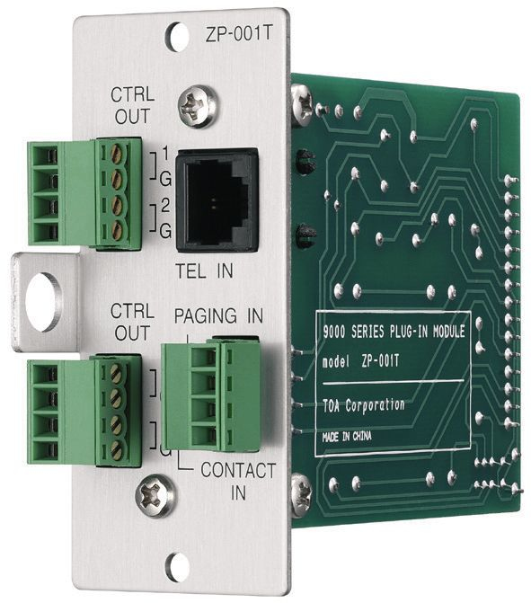 Telephone zone paging module\n\nThe ZP-001T is a Zone paging module designed for use with the 9000 Series amplifiers and functions as interface to connect the 9000 Series amplifier to an analog PABX, allowing zone paging to be initiated from the PABX. There are two operation modes: ring signal and paging port modes. Broadcast can be initiated regardless of operation mode.\n\nTelephone Access Paging to up to eight zones. Uses DTMF dialing to access amplifier and/or line outputs. Dial up to eight output zones in one operation.Analog Extension or Page Port compatible. Page port operation requires contact closure activation and DTMF signal pass-through. RJ-11 Telephone Jack and Removable Terminal Blocks