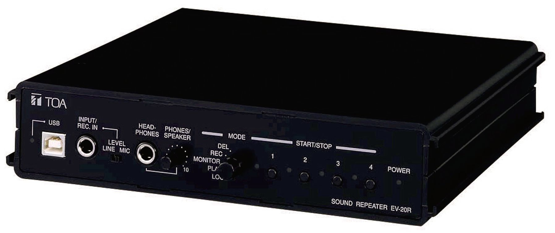 The rack-mount digital message repeater shall have three minutes of CD-quality digital storage capacity with four selectable messages/tones. The messages shall be stored as 44.1k Hz, 16 bit PCM (monaural), uncompressed WAV format and shall be transferred via USB interface of recorded directly to unit via front panel mic/line input (switchable). The unit shall include a built-in amplifier (3 W, 8 ohms, terminal block type connector) for direct speaker connection, a balanced line input (Input / Recording input: Mic: -60 dBV Line: -20 dBV, 10k ohms, (switchable Mic/Line), unbalanced, phone jack 0 dBV, 10k ohms, unbalanced, terminal block type connector) pass-through to balanced line output (0 dBV, 600 ohms, unbalanced, terminal block type connector) with automatic muting of external source during message activation and a headphone output (0 dBV, 100 ohms, unbalanced, phone jack) with adjustable volume control. Individual message activation shall be accomplished via front panel and/or rear panel switch inputs (no-voltage make contact input, pulse make length: 200 ms, open voltage: 30 VDC, short-circuit current: 10 mA) with terminal block type connector. A stop input terminal shall allow immediate termination of current messages. Features shall include an adjustable broadcast delay time (0, 2 and 4 seconds) and an interval timer to allow messages to be repeated at various time intervals (0/5/10/30 seconds or 1/5/10/30 minutes, 1 hour or continuous). A control output (contact capacity: 30 VDC/0.5 A) with terminal block type connector shall activate during message playback.\n\nPower shall be derived from an external 24 VDC/400 mA power supply or external 24 VDC input with power consumption of 10 W (rated output). Specifications shall include frequency response of 20 to 20k Hz +/- 3 dB (1k Hz) and distortion under 1% (1k Hz, rated output). Front panel LED indicators shall include POWER, USB and START/STOP 1-4. Finish shall be black ABS resin. Dimensions (W x H x D) shall be 8.23“ x 1.74“ x 7.13“ (210 x 44.2 x 181 mm) and weight of 1.61 lbs. (730 g).