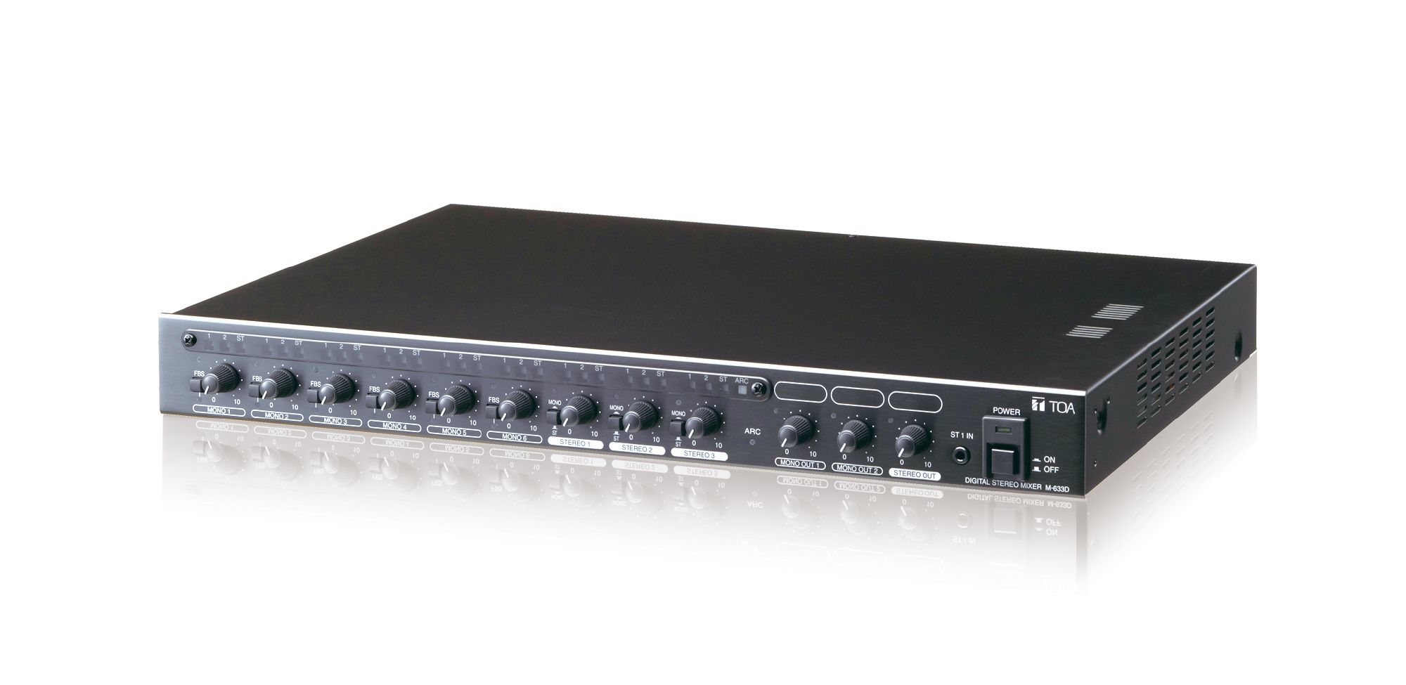 The M-633D is a stereo mixer equipped with 12 input channels (6 monaural inputs and 3 stereo inputs) and 6 output channels (2 monaural outputs, 1 stereo output, and 1 stereo recording output). It has 2 monaural channel and 1 stereo channel bus lines, allowing each input signal to be assigned to each bus line individually. It features digital signal processing functions such as Automatic Resonance Control function, Feedback Suppressor function (FBS), Automatic Clipguard function (ACG), and Automatic Mute function (AUTO MUTE).\nIt performs advanced acoustic compensation by means of automatic processing without the use of an acoustic measuring instrument. It can be mounted in an EIA component rack (1U size).