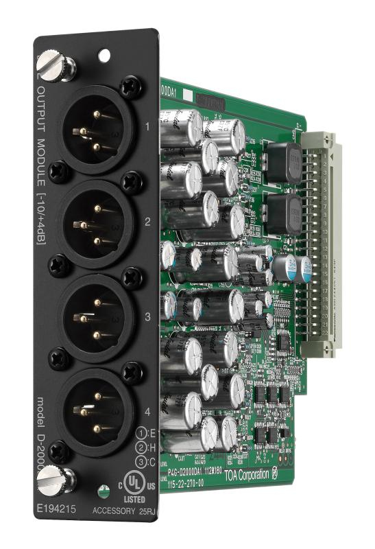 The D-2000DA1 Line Output Module is designed for use with the D-2008SP Digital Mixing Processor Unit and features high quality sound. The output level of each output terminal can be independently set to either +4 dB or -10 dB and its output mode independently set to either balanced or unbalanced type by the built-in DIP switch. It employs XLR type connectors.