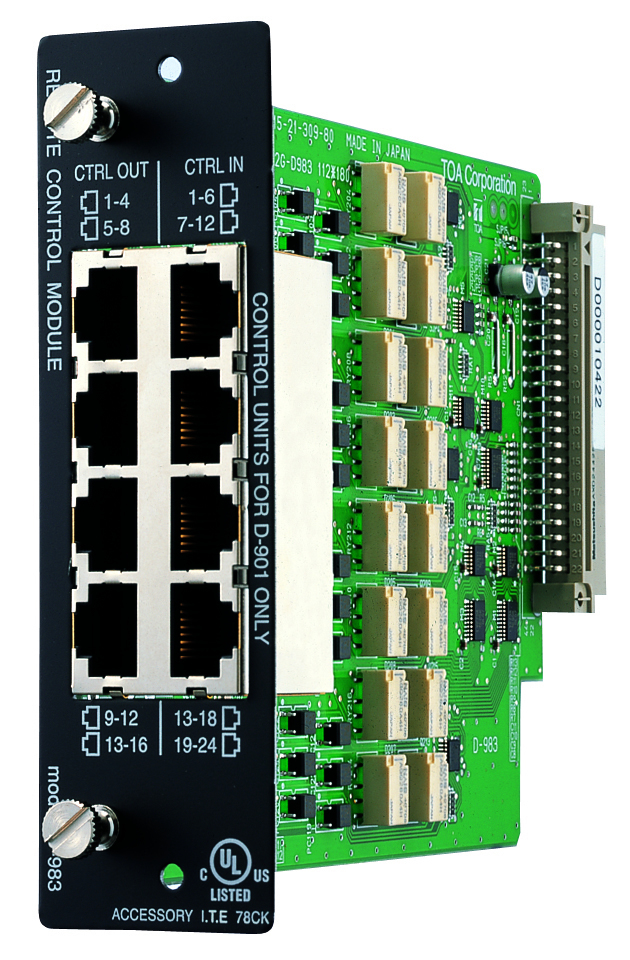 The D-983 is a remote control module designed for used with the D-901 Digital Mixer, etc. It permits preset memory recall, input/output channel volume control, stereo input selection and channel ON/OFF operation to be remotely controlled from external equipment. Tally output can also be provided for external control.