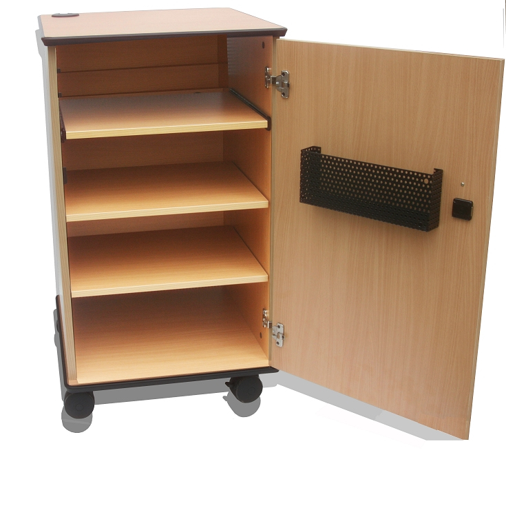 - Three shelves.\n- Top shelf is slide-able.\n- Bottom two shelves are height adjustable.\n- Cable outlets on top and rear.\n- Rear ventilation grill.\n- Door opens 270 degrees.\n- Lockable (two keys supplied)\n- Four heavy duty castor wheels (two with brakes)\n- Cable tidy management at the back of the unit.