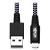 The M100-006-HD Heavy-Duty USB Sync/Charge Cable connects your latest-generation iPhone, iPad or iPod to the USB-A port on a computer or USB wall charger, so you can charge your Apple device and transfer data. The reversible 8-pin Lightning plug connects in either direction to ensure fast, easy connection every time. Constructed using bulletproof Aramid fiber to reinforce the conductors inside the cable, this heavy-duty Lightning cable features enhanced protection to stand up to the most rigorous use. The double braided nylon jacket and integral strain relief provide additional strength and flexibility to endure the stress and abuse of frequent use. The six-foot (1.8-meter) heavy-duty Lightning cable is MFi-certified for use with the latest generation of iPhone, iPad and iPod devices.