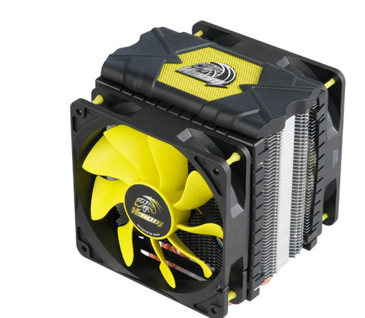 - Rapid heat transfer from CPU to aluminium fins.\n- Dual 12cm viper fans for extreme performance.\n- 12cm Viper fan with S-FLOW blades delivers 30% more airflow.\n- Six high capacity heatpipes with direct CPU contact for rapid heat transfer.\n- high grade aluminium profiled fins ensure optimum heat dissipation.\n- Siliconized rubber fan mounts for easy installation and ultra quiet performance.