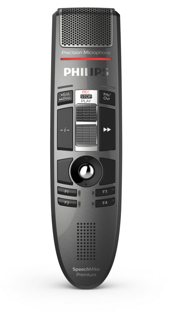 Best-in-class recording with Precision Microphone\nThe SpeechMike Premium takes dictation to a new level. May it be the free-floating studio quality Precision Microphone, a microphone grille with optimized structure, built-in noise-reduction pop filter, antimicrobial surface or the motion sensor – the SpeechMike Premium sets the new standard.\nFree floating, decoupled microphone for precise recording\nThe microphone in the new SpeechMike Premium is decoupled from its housing for the most incredible crystal clear recording performance ever to be delivered by a desktop dictation device. The completely redesignedmicrophone suspension guarantees that almost no background, touch, click, air or structure-borne noise is recorded. This technique is derived from studio microphones to make sure there are no sound distortions whatsoever – and to guarantee outstanding speech recognition results.\nMicrophone grille with optimized structure for crystal clear sound\nA well-engineered microphone grille is able to make a high-end microphoneas in the new SpeechMike Premium stand out even more. The hexagonalholes used for the metal grille feature three times more open surface than itspredecessor, engineered to provide crystal clear recordings.\nIntegrated pop filter for perfect quality\nThe microphone area of the SpeechMike Premium is made of many differentlayers to make it sound as clear and original as possible. One of those is a fleece inserted above and below the microphone capsule. The fleece filters out sound distortions such as pop and hiss noise, guaranteeing perfect results even if dictating closely into the microphone.\nLarge speaker area for premium playback\nCompared to its predecessor, the SpeechMike Premium is equipped with adouble sized-speaker area that enables it to play back recordings in clear andcrisp quality.\nErgonomically shaped for perfect fit in the hand\nThe device is designed to fit perfectly into the hand and reduce unintentional pressing of buttons. The trigger and the ‘command’ button on the back of the device are engineered to be in easy reach for the fingers.\nWear-free slide switch or push buttons for comfortable operation\nThe SpeechMike Premium comes with a slide-switch or a push-button operation. The slide switch is wear-free and ergonomically shaped with a softly ribbed surface for smooth tactile feedback and comfortable and intuitive utilization. In addition, our engineers implemented a millionfold proven contactless slider detection, making it completely wear-free for an extra-long lifetime.\nIntegrated motion sensor mutes microphone when not in use\nBeing on the cutting edge of technology, the Philips SpeechMike Premium comes with an integrated motion sensor, making it the first stationary dictation device that can be controlled by the movement of your hand. It detects when it’s put on the table, mutes the microphone, and once it is being picked up again it unmutes the microphone. There are plenty of situations this feature can be greatly beneficial; just think of an incoming phone call or someone stepping in your office. In addition to that, custom events can be programmed, e.g., to pause and to continue the recording.\nTrackball for integrated mouse function\nThe device comes with a trackball. This allows the user to easily control and navigate within applications while recording, without having to switch between the mouse and microphone. The trackball can even be taken out of the device for cleaning, if this should ever be required. The self-lubricated and abrasive resistant Teflon bearings guarantee a smooth operation over the entire lifetime.\nFreely configurable function keys for a personalized workflow\nThe Philips SpeechMike Premium is the most advanced dictation microphoneto date – and to give the user even more room to personalize their devices,Philips has added an instruction key at the top of the control panel – of coursefully and freely user configurable, especially useful for programming speechrecognition commands.\nAntimicrobial housing and buttons for hygienic working\nThe SpeechMike Premium’s housing and buttons are made of antimicrobialsynthetics, guarding it against all kinds of germs. Antimicrobial materialswork against a wide range of different microorganisms such as bacteria(e.g. pneumococcal bacilli and multiresistant microorganisms such as MRSA),viruses (e.g. HIV, influenza, etc.), fungi (e.g. Aspergillus niger), or algae. Theantimicrobial effect on the SpeechMike Premium lasts for at least five years.\nSmart, backwards compatible firmware for extra flexibility\nCustomers can upgrade from their previous SpeechMike model without installing additional software. For integrators, this means no changes need to be implemented and the existing SDK can be used. The SpeechMike Premium is compatible with Mac and Windows operating systems, as well as virtual environments such as Citrix, VM Ware and Hyper-V. It can be configured using SpeechControl, the convenient Philips hardware management tool.