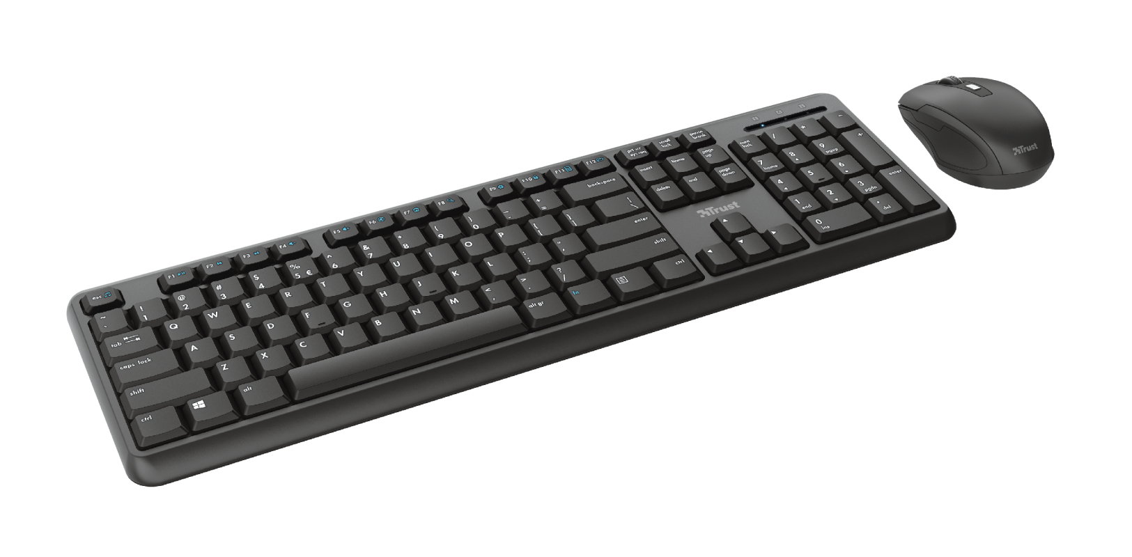 Makes Work Easy The Trust TKM350 Silent Wireless Keyboard with Mouse is the right combo to make your work more comfortable than before. The silent keys prevent others from being disturbed by your work, the keyboard itself is spill resistant, and thanks to this set being wireless it will provide plenty of flexibility. It even comes in easytoopen and sustainable packaging, made of 100% recycled material, that saves both the environment and time. Everything You Need The TKM350 Silent Wireless Keyboard provides everything you need for a smooth typing experience. The lowprofile fullsize layout has a silent keystroke, while the adjustable angle and rubber antislip feet will help you work comfortably for hours. It’s spill resistant and has 12 multimedia function keys; everything you will ever need to get the job done. Modern Mouse The accompanied mouse has a similar modern design and comes with silent buttons as well. No one will be disturbed by your hard work. It has a DPI button so you can adjust the speed of your cursor, and the mouse uses a reliable optical sensor so you can work on most surfaces. Flexibility is the keyword, here. Wireless Without Hassle This set uses the same wireless USB receiver for both the keyboard and the mouse. Just plug it into a free USB port in your PC or laptop and you’re good to go. And when you’re done, you will easily store the receiver in the mouse itself when you want to take this set with you.