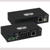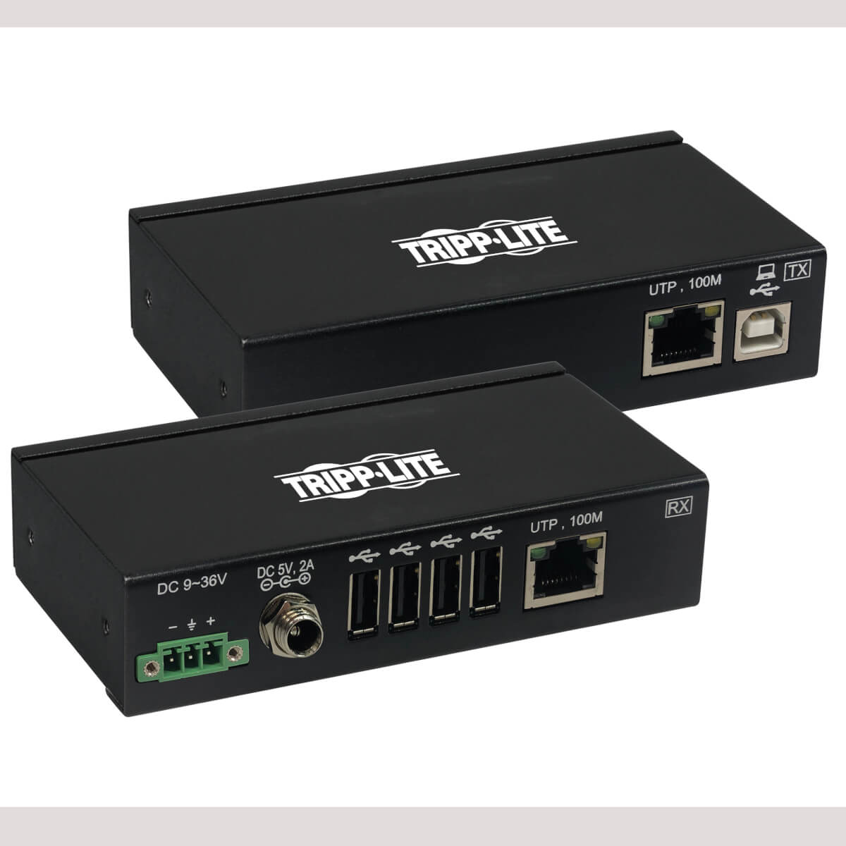 Industrial-Grade Extender Connects Your Computer to 4 USB Devices up to 330 ft. Away\nThis plug-and-play extender kit with heavy-duty all-metal housings is ideal for connecting your office computer’s USB-A port to a printer, 1080p webcam, external hard drive and other USB devices located up to 330 feet (100 meters) away. The B203-104-IND-ER includes a local transmitter and a remote receiver that extends USB 2.0 signals over user-supplied Cat5/6 cabling (such as N202-Series Cat6 Ethernet cables).\n\nBuilt-In Power over Cable Technology Provides Power to Avoid Bulky Power Bricks\nPoC powers the transmitter over Cat6 cable. Green and orange LEDs on both units will light up to indicate they are receiving power and data is being transmitted. PoC gives you the freedom to place the transmitter or receiver away from AC outlets, avoiding the hassle of running new power lines and multiple bulky power bricks. Note\n: if connected to a high-density USB hard drive, you may use the receiver’s RS-232 Phoenix connector or external power supply to add external power.\n\nProtects Your Devices Against Electrostatic Discharge (ESD)\nMachines on the shop floor can generate electrostatic discharges, wiping out data and damaging sensitive electronics. This extender kit provides ESD protection to ±15 kV, reducing potential static damage to your connected USB peripherals. The durable metal transmitter and receiver units withstand harsh physical conditions in industrial and commercial applications, such as factories, construction sites, supply rooms and warehouses.\n\nWith Great Distance Comes Great Flexibility\nBy extending the USB connection beyond the standard 16-foot distance limitation to 330 feet, the B203-104-IND-ER provides workstation flexibility to place your computer and the USB devices where they are best suited. This extender kit supports USB 2.0 data transfer rates up to 300 Mbps and is backward compatible with USB 1.1 technology, allowing you to connect legacy devices. No network connectivity is needed.\n\nPlug-and-Play Kit Offers Flexible Power and Installation Options\nWith user-supplied USB cables, connect the transmitter to your computer and the receiver to your USB peripherals. Connect the transmitter and receiver with a user-supplied Cat5/6 cable (all cables sold separately). The extender kit requires no software to download and install. The metal chassis rest easily on any flat surface or mount to a wall or DIN rail using the included hardware. A power supply with international plug adapters, as well as a RS-232 Phoenix adapter supporting a DC voltage range from 9-36V, are included for connecting external power to the unit as needed.\n\nTAA-Compliant for GSA Schedule Purchases\nThe B203-104-IND-ER is compliant with the Federal Trade Agreements Act (TAA), which makes it eligible for GSA (General Services Administration) Schedule and other federal procurement contracts.