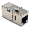 Strengthen your high-speed network with the N235-001-SH-D Cat6 Straight-Through Modular Shielded In-Line Snap-In Coupler (F/F). It connects two Cat6 patch cords to create one longer cable. Its keystone design is perfect for convenient feed-through patching when used with a standard data wallplate (such as N042-001-WH). One RJ45 port is angled down at a 90-degree angle for easy installation in hard-to-reach spaces. Built for ultra-fast performance, this is an ideal coupler when setting up premise wiring, telecommunications, data networking and Ethernet connections.\n\nCompatible with all Cat6 cables, the N235-001-SH-D’s protective metal housing is fully shielded to reduce EMI/RFI interference that can damage or degrade data. This coupler features straight-through wiring and 50-µin gold-plated contacts designed to resist corrosion. The N235-001-SH-D is UL-listed and meets all requirements for EIA/TIA Category 6 compliance. It’s also backward compatible with Cat5e and Cat5 LANs.