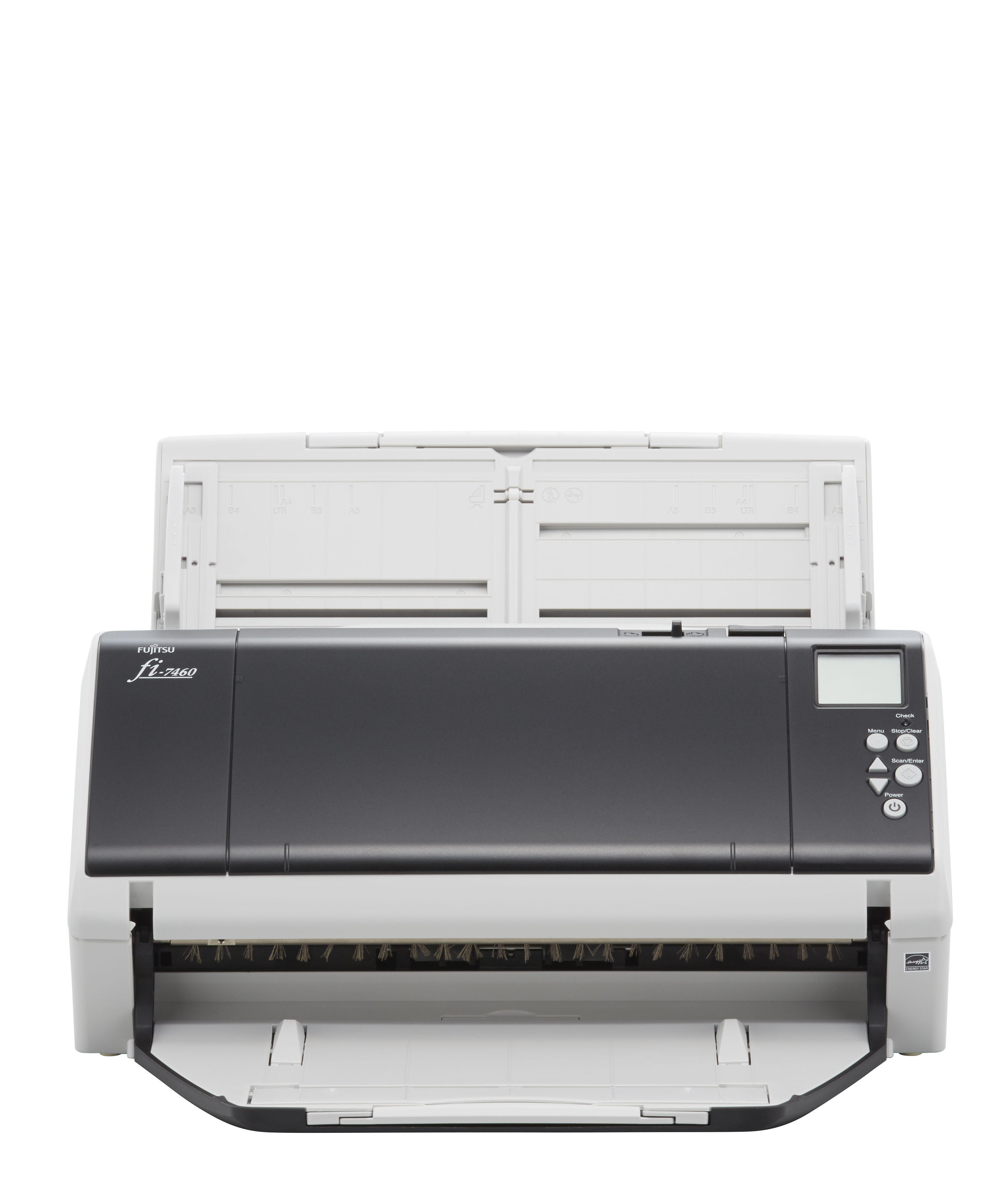 Fujitsu fi-7460, Superior A3/A2 format scanning technology distributed to the desktop\n- Versatile document capturing capability for any size document from A8 to A3, folded A2 and A1 and up to 5.5 meters in length - from plastic to paper, thick to thin, with surface quality variations\n- Retractable roller mechanism allows for scanning booklets and filled envelopes\n- A4 landscape at 300 dpi; 60ppm/120ipm, scan mixed batches up to 100 sheets\n- Uninterrupted scanning: Paper feeding and replenishment during operation\n- Uninterrupted capture routines: Collect diverse documents into a unified digital file\n- Compact dimensions: Base footprint only slightly larger than an A4 sheet of paper\n- Sensitive: Treats delicate documents with utmost care\n- Equipped with Intelligent Sonic Paper Protection that is based on acoustic sensors\n- Skew reducer - Independent pick rollers ensure a skewed document will not affect the alignment of following sheets\n- Integrated backlight LCD and Scanner Central Admin tools for hassle free monitoring and administering\n- PaperStream IP and PaperStream Capture; Fujitsu developed scanner driver and image enhancement plus batch capture software application\nThe fi-7460 is easy to set up, use and maintain and comes bundled with a user friendly and intuitive scanner driver PaperStream IP along with batch scanning automation and enhancement software PaperStream Capture. A4 landscape scanning speeds in both colour or black and white at up to 300 dpi is 60 pages per minute or 120 images per minute through the 100 page capacity ADF. The fi-7460 can scan a huge variety of material from plastic cards to booklets to even folded A1 in size.\nIntuitive feeding functions\nThe fi-7460 scanner comes with a unique paper protection function that is based on acoustic sensors; iSOP (Intelligent Sonic Paper Protection), iSOP reduces the risk of having documents damaged by sensing the audible noise of paper movements and stopping the feeding of sheets when an irregular noise is encountered.\nThe scanner additionally makes use of an ultrasonic sensor that accurately detects multifeed errors where two or more sheets are fed through the scanner at once plus intelligent multifeed function that is designed for documents that intentionally feature paper attachments of defined sizes or locations such as sticky notes or photos. The scanner can automatically recognise the location of the attachment and will then exclude that zone from triggering alert conditions.\nSkew Reducer helps ensure straight paper feeding\nShould you be scanning mixed batches of differing thicknesses of documents then the “skew reducer” eliminates the risk of physical skew being carried over from one sheet in a mixed batch to the next ensuring that each document is captured with the utmost precision and simplicity. Multi-segmented pick rollers that rotate independently ensure that if a document goes through skewed then this will not affect the alignment of the next document.\nHassle free monitoring and administering\nIntegrated within the operating panel a backlight enhanced LCD shows useful information such as current scanner settings, operating status and a paper counter, in addition the fi-7460 comes with Scanner Central Admin tools that includes functions that system administrators can use to manage the installation and operation of multiple scanners, monitor operation status and update drivers and software from one location. This ability dramatically reduces the cost and work that goes into setting up, operating and maintaining many scanners in an organisation and also in expanding the scanner network to multiple locations.\nPaperStream IP and PaperStream Capture\nThe fi-7460 comes bundled with PaperStream IP, an integrated scanner driver and image enhancement module that is built on TWAIN/ISIS standards offering user friendly operability, intuitive high quality image creation and real time processing that will benefit post scan routines like OCR. PaperStream Capture enhances the document capture process from adjusting scanning settings to performing batch scanning, verifying data and releasing to directories, repositories or subsequent process routines. Users can complete data capture tasks easily with the extremely user-friendly graphical user interface (GUI). Moving scanned batches into a queue for later retrieval is possible as well.\nService and Support\nA one year Advance Exchange is offered as a standard warranty and this includes online support along with parts/labour and shipping costs. Advance Exchange involves the delivery of a refurbished scanner which replaces the faulty scanner.\nService upgrades are available that extends the warranty period from between 1 to 5 years and additionally offers the possibility for items like onsite service with impressive response and repair times, accidental damage cover and remote desktop support.