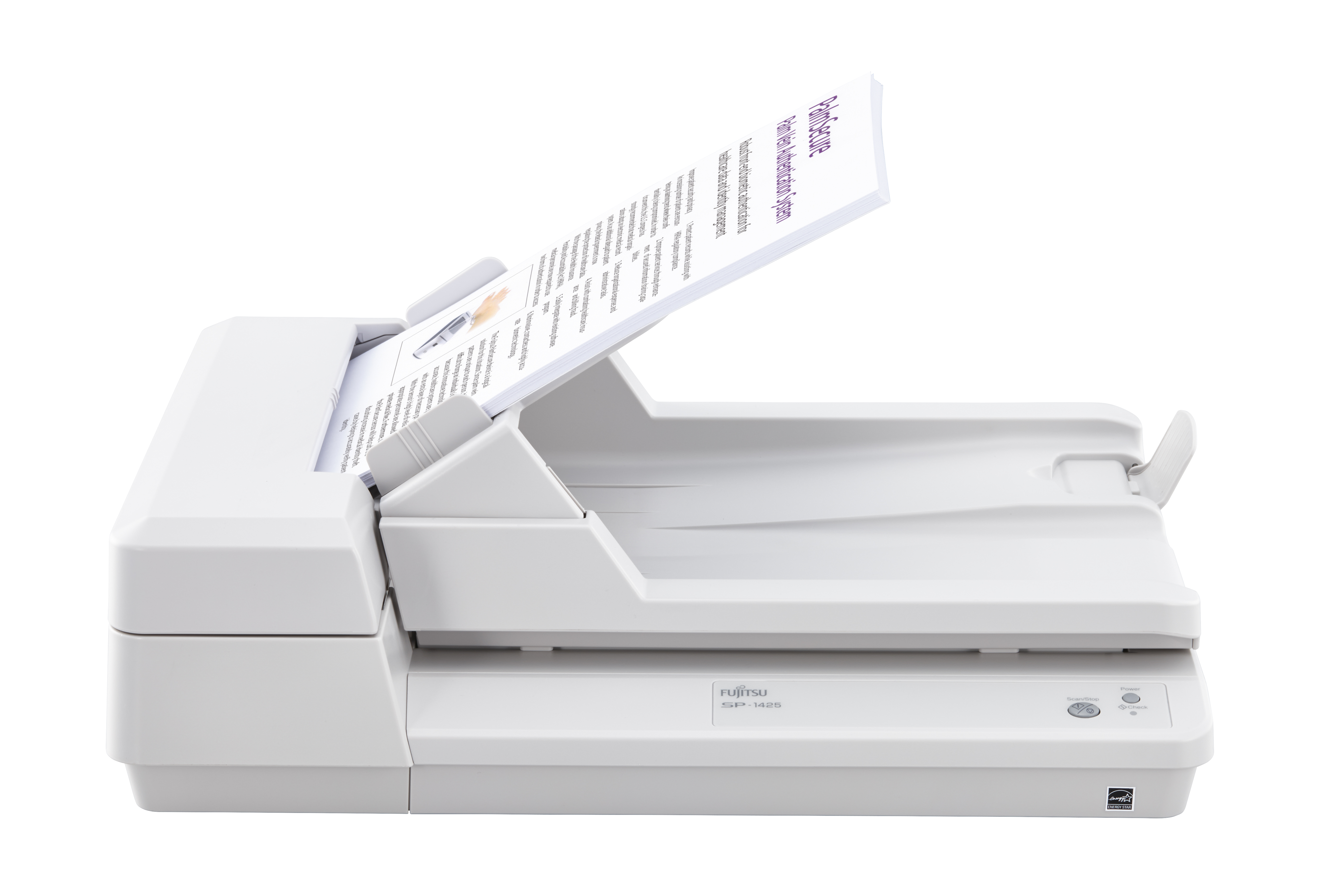 Versatile.\nEntry point into professional document management\nResourceful.\nPurpose built with impressive software suite for efficiency gains\nReliable.\nIntuitively and dependably converts physical documents to digital format\nConvenient.\nSimple and easy to use design, ideal for desktop placement.\nRaise your productivity with efficient image capture\nEvolve from your physical to electronic documents with digital ease with the SP-1425. Create one single source reference for all your data by merging these with your digitally born documents. Gain the business advantages of working with more convenient, flexible and secure digital images using simple push button routines, the SP-1425 feature a simple operation panel with only 2 buttons (Scan / Stop and Power) as well as software enabled push button management.\nStore, retrieve and manage your documents more productively, efficiently and cost effectively than paper records allow. At the same time actively embrace compliance risk avoidance concerns and increase your customer’s satisfaction.\nCost effective high performance\nAchieve more in less time. Remove your backlog of documents and transform mixed batches of different thicknesses and sizes including plastic cards into high quality images. The SP-1425 has been especially designed to provide a simple but efficient paper to digital document capture platform for all types of businesses looking to adopt a more systematic approach to regular document capture\nDesktop convenience\nMeasuring only 454 x 331 x 129 mm (W x D x H), the compact design of the SP-1425 model takes up minimal space on a busy desktop. The small footprint means these devices are always available and within reach for uninterrupted performance. Trade a small desktop space to reclaim a much larger space taken up by paper records.\nBundled with business enhancing functionality\nTurn lifeless business records into searchable, secure yet dynamic documents that can\nbe fed into digital archives. The bundled version of ABBYY FineReader Sprint creates\nsearchable and editable files from your paper documents allowing you to retrieve information more efficiently at a future date (the OCR processing can handle 190 languages). Presto PageManager offers further possibilities for the enhancement, conversion, collaboration and organisation of your files.\nDocument handling and archiving confidence\nWhether dealing with healthcare, legal, financial or other documents that need to comply with long term storage regulations the SP-1425 helps support the efficient on-ramp into your archives.\nFaster throughput when it is needed\nThe SP-1425 model through their 50-sheet automatic document feeder (ADF) can process single or double sided pages at the same time. The SP-1425 can scan 25 A4 single sided pages per minute (ppm) or 50 images per minute (ipm).\nPaperStream IP – high quality image enhancement\nPaperStream IP is the scanner driver for the SP-1425. In addition to being fully compliant with the industry standard TWAIN and ISIS interface, PaperStream IP incorporates as standard, highly sophisticated image processing that automatically applies features such as noise removal, background pattern removal and character augmentation to produce exceptionally clear, high quality images that are suitable for direct import into the users’ workflow.\nPaperStream IP has an intuitive, easy to use interface that can be switched between Administrator or User mode to simplify the scanning process and reduce user error.\nAdditionally PaperStream IP also introduces a new Assisted Scanning mode, which allows the user to visually select the best quality image from a range of images of the page, rather than needing to manually fine tune the scanning parameters one by one.\nPaperStream Capture Lite is a powerful application used to scan documents with the SP-1425. It is extremely easy-to-use and provides an interface similar to a mobile application that allows users with little scanning experience to use the scanner almost instantly. PaperStream Capture Lite is based on the “One Click Capture” concept, which promotes reducing the number of times to touch the screen. It is effective in the prevention of operational errors as well as streamlining repeated operations. PaperStream Capture Lite presents itself as an essential capture tool for feeding TIF, BMP or JPEG files into defined capture routines by simply selecting a pictogram presented on screen. The software can be downloaded from the website designated in the Setup DVD-ROM.\nThe SP-1425 features a built-in flatbed module that enables the scanning of diverse document types such as those that may be bound, stapled or delicate.