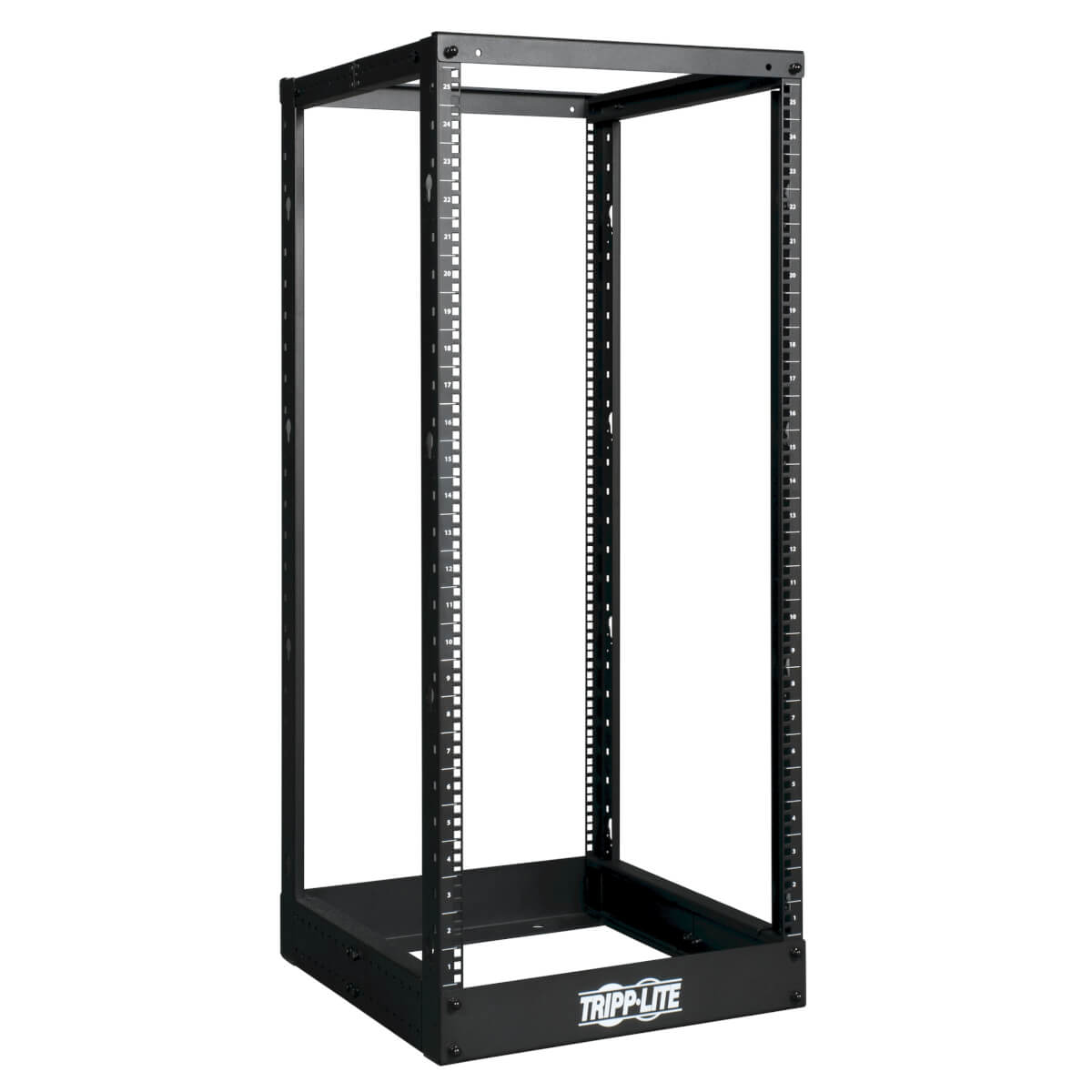 The 25U 4-Post Open Frame Rack helps IT managers organize their equipment array and provides fast, easy access to installed IT equipment. The SR4POST25 is a simple solution for housing IT equipment in secure environments and other areas that don't require a lockable rack solution. This 25U rack features heavy-duty cold-rolled steel construction with a black powder-coated finish for durability. It supports stationary loads up to 1,000 pounds (453.6 kilograms). The SR4POST25 comes with all the hardware required for assembly and has a self-squaring design with bolt-down provisions. For high-density applications, multiple units can be bolted together side by side.\n\nThe open design of the SR4POST25 provides unobstructed airflow and easy access to equipment and cabling. It has numbered, square-hole mounting positions for easy installation of standard 19-inch rack equipment. The SR4POST25 supports equipment depths from 22 to 36 inches. This rack also accommodates toolless button-hole mounting for vertical PDUs and cable managers.