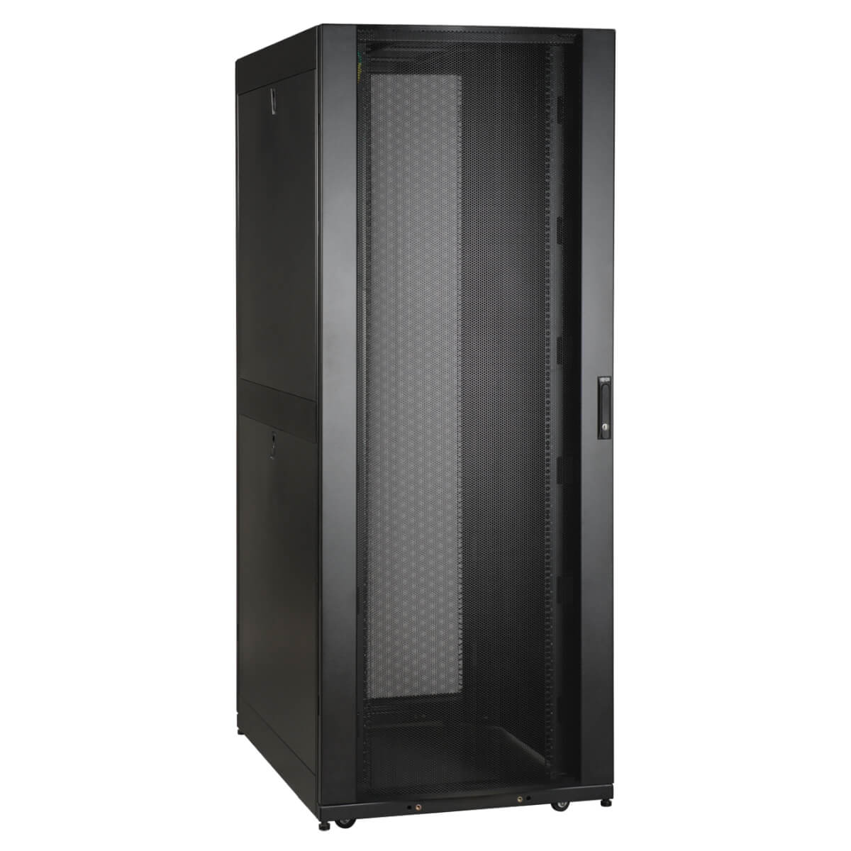 Ships fully assembled for rapid deployment and roll into place on heavy-duty pre-installed casters.\nFront and rear sets of equipment mounting rails adjust in 1/4" increments. Adjustment is quick and convenient. The easy-view depth index ensures consistent rail placement without requiring time-consuming measurements.\nToolless accessory mounting rails (2 rails per enclosure) include slots for quick installation of compatible PDUs and vertical cable managers. Mounting slots are arranged in an industry-standard pattern compatible with a wide variety of accessories. Each rail can accommodate two vertical PDUs or cable managers side-by-side (four items per enclosure).\nEnclosure includes mounting hardware of 50 pieces of M6 cage nuts and 50 pieces of M6 screws\nTextured powder coat finish for tough resistance to environmental concerns such as deployment in warehouses.\nMassive front to rear ventilation capacity. 65+% open space in door perforation pattern meets or exceeds server manufacturer requirements.\nMaximum usable internal depth of 37 inches/94 cm (front to rear rail).\nWeight ratings of 3500 lbs (1588 kgs) stationary and 2250 lbs (1020.6 kgs) rolling.\nFront door is locking, reversible and removable.\nRear doors are locking and reversible. Split rear door design reduces clearance requirements for service entry allowing the enclosure to be placed closer to a wall.\nLocking removable side panels are 'half size' to make them smaller and lighter improving ease of installation and servicing. Two side panels per side (4 panels total). Side panels are keyed alike to the front and rear doors.\nBuilt in baying tabs allow enclosures to be combined securely in rows. Center-to-center width can be set at 750mm or 30".\nCasters are pre-installed and support a rolling load capacity of 2250 lbs (1020.6 kgs), allowing the enclosures to be pre-configured and rolled to the final installation location. Casters are removable.\nLeveling feet extend to allow enclosure to be positioned on uneven floors. Levelers are removable.\nCompact design allows the enclosure to roll through standard height commercial doorways.\nConvenient grounding system. All components are grounded to the enclosure frame which includes multiple connections for facility ground. Front and rear doors include quick-release ground wires.\nOpen bottom for cable access.\nTop panel has generous cable access holes. Panel can be removed toollessly in seconds without having to disconnect cables first.\nIncluded stabilizing brackets are used for shipment and can be reattached at the bottom of the enclosure frame on the inside or outside of the rack.\nMeets all enclosure requirements towards PCI DSS (Payment Card Industry Data Security Standard) Compliance\nCompatibility with airflow optimization accessories as well as cable management accessories.
