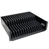 The SR16SHELF 3U Rack-Mount Configurable Storage Shelf securely stores up to 16 personal electronic devices in your wall-mount or floor rack enclosure. Ideal for storing tablets, laptops, Chromebooks and other similar devices, the SR16SHELF comes preset with 0.8 inches of spacing between its plastic dividers. However, the 15 dividers can easily be removed and adjusted to fit your devices.\n\nCompatible with all EIA-compliant 19-inch wall-mount and floor rack enclosures, the SR16SHELF is covered in non-scuff paint designed to resist scratches. The devices’ charging cables pass through ports with rubber grommets that hold the cable in place and prevent clutter and tangles. All mounting hardware included. Mounts into 3U of rack space, but may require additional rack space depending on the size of the devices being stored.
