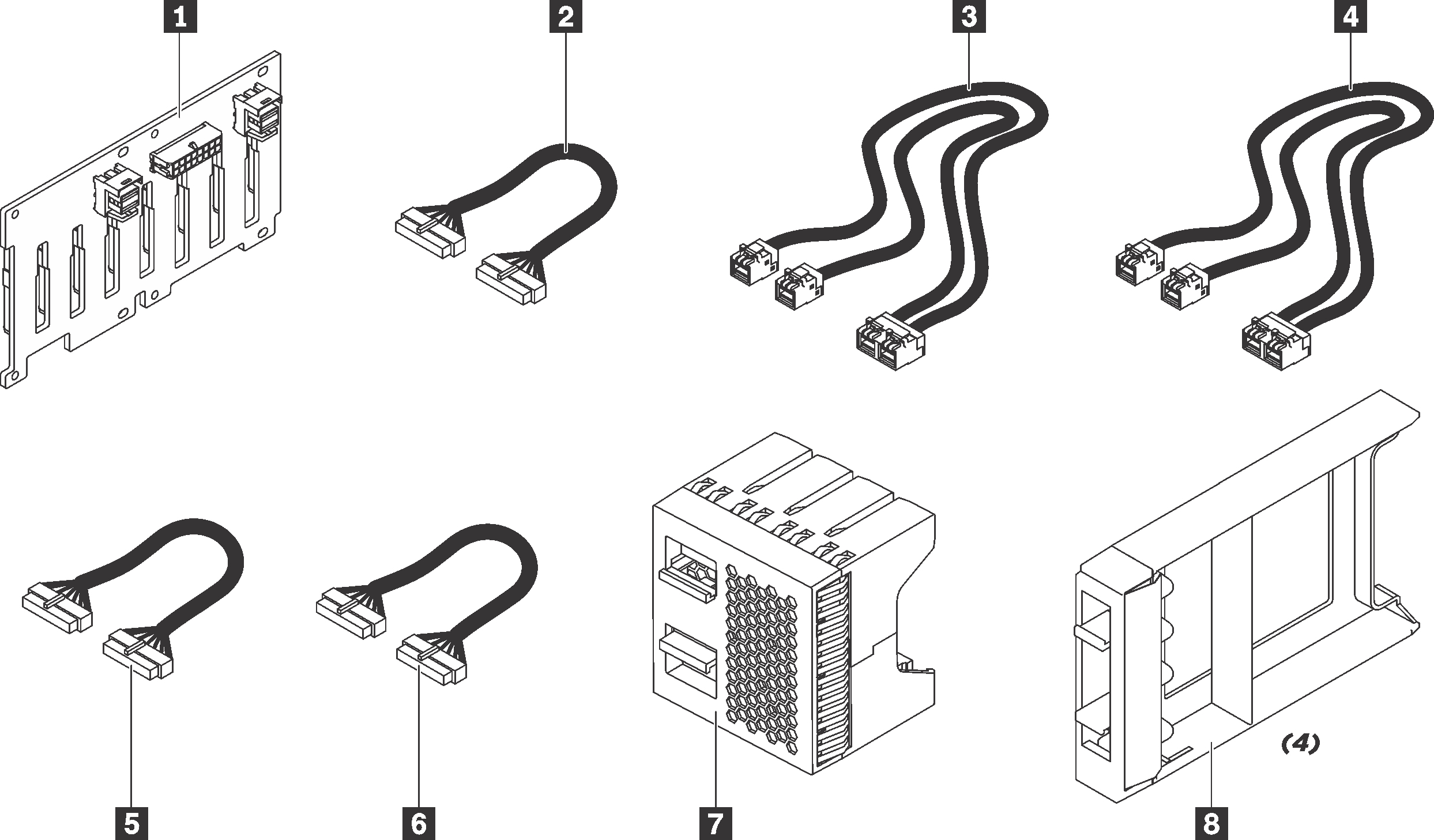1 2U 2.5" SATA/SAS 8-Bay backplane\n2 SR650 second& third 8x2.5" or 12x3.5" NVME HDD backplane power cable\n3 SR650 8x2.5" HDD backplane signal cable\n4 SR550 8x2.5" HDD backplane signal cable\n5 SR550 second 8x2.5" HDD backplane power cable, SR650 first 8x3.5", 12x3.5" or 8x2.5" HDD backplane power cable\n6 SR550 first 8x2.5" HDD backplane power cable\n7 4x1 2.5" HDD filler\n8 1x1 2.5" HDD fillers (4)
