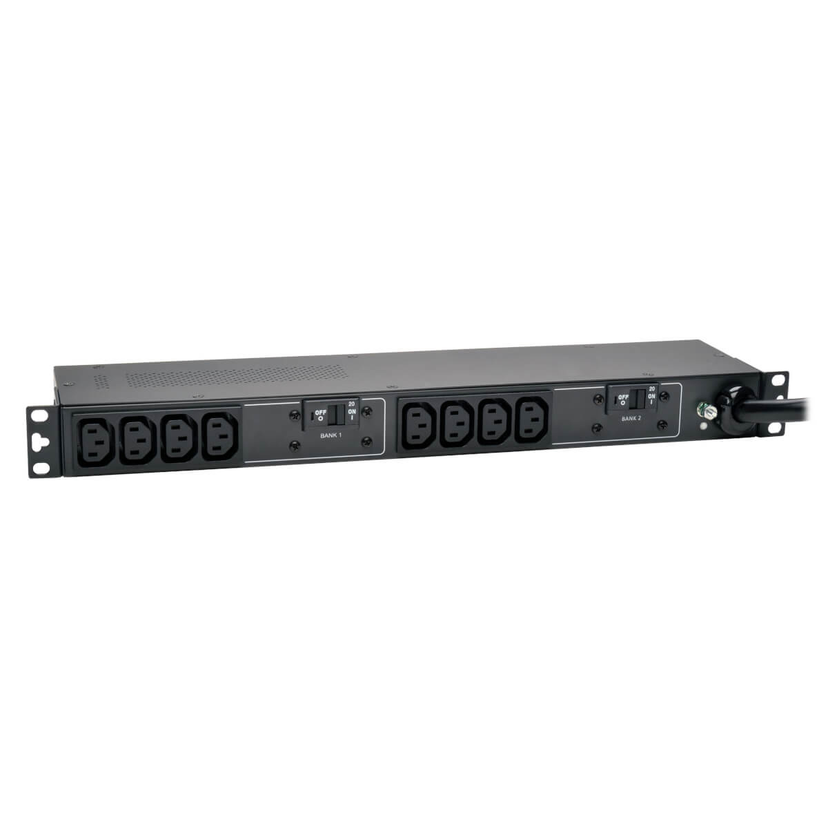 The PDUH32HV 7.7kW Single-Phase 200-240V Basic PDU is a versatile no-frills unit for data centers, server rooms and network wiring closets. Perfectly suited for high-density IT environments, the PDUH32HV features 10 total outlets—two in front and eight in the rear. The IEC 309 32A Blue (2P+E) input plug with 3.6 m cord connects to your facility’s compatible AC power source, generator or protected UPS to distribute power to connected equipment.\n\nThe switchless design prevents an accidental shutdown, which could lead to costly downtime. Dual 20A circuit breakers protect connected equipment from dangerous overloads. The reversible all-metal housing supports a variety of mounting options, including 1U horizontal or 0U vertical mounting in EIA-standard 19-inch racks, under a counter or on a wall or workbench.
