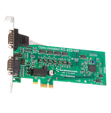 PCI Express Card providing two opto isolated RS422/485 serial ports. Data transfer rates up to 921,600 baud rates and the 128 byte deep transmitand 128 byte receive FIFOS, coupled with 1Mbit/s line drivers deliver uncompromising performance on your PC. Optical isolation provides greater protection from electrical current surges to both the card itself and the PC. It improves noise immunity by isolating the PC from the card's transmit ground. Drivers for Windows 32 bit and 64 bit Operating Systems including Windows 2000, XP, Server 2003, Vista, Server 2008 and Windows 7.